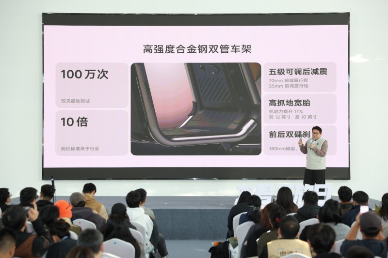 第二个核心能力是铠甲级的安全。九号对安全的追求超越了简单的标准符合,致力于为用户提供“铠甲级”的防护。其F系列车型采用了强度高于行业标准10倍的高强度双管车架;创新的“铁甲车身”方案,在严格遵守塑件阻燃国家标准的基础上,大幅提升了安全阻燃能力,能将恶性自燃风险降低超过44.7%;高抓地力轮胎在保证续航的同时,显著提升了湿地操控性;整车电子器件达到高等级防水,并配备了摩托车级别的TCS(牵引力控制)等主动安全技术。新国标车型意味着更安全,而九号智能新国标车型,实现了高于新国标标准的安全承诺,希望树立行业安全新标杆。