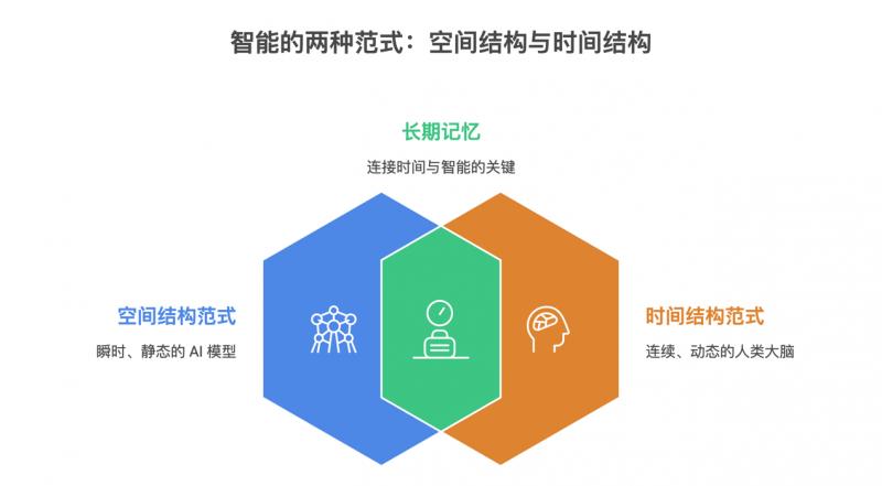 今年10月27-28日,陈天桥在天桥脑科学研究院在美国旧金山举办的首届天桥脑科学研究院AI驱动科学研讨会(Symposium for AI Accelerated Science,AIAS 2025)上系统阐述了包括“长期记忆”在内的发现式智能五种核心能力。他指出,当今的 AI 建立在 “空间结构”范式 之上——这种范式是「瞬时的」「静态的」,本质上通过规模化参数去拟合
