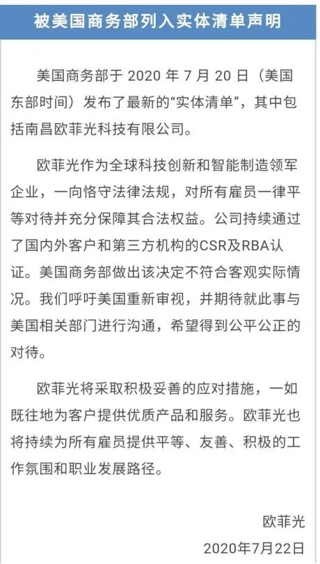 值得一提的是,7月20日,美商务部已将11家中国实体列入出口管制“实体清单”,其中包括南昌欧菲光科技有限公司。