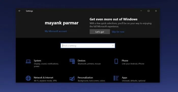 该广告中写道:“只需要简单的快速选择,你就能享受更完整的微软体验”。点击“Let's Go”按钮会打开全屏非窗口的 OOBE 屏幕。