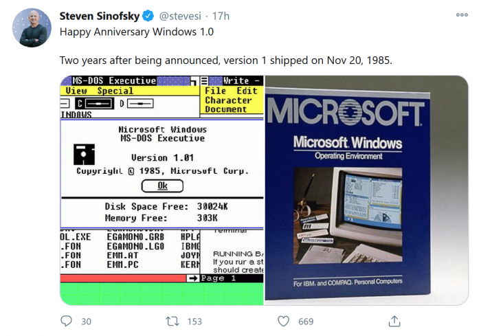 前Windows负责人史蒂文·辛诺夫斯基发文庆祝Windows 1.0 35周年