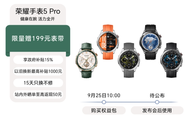 即日起参与荣耀手表5 Pro预约,可享受199元礼品表带免费送等5大权益!权益一,连带优惠,购买荣耀 Magic 全系列&荣耀折叠全系列用户,赠送200元通用权益(仅体验店)。权益二,购机礼赠,购荣耀手表5 Pro用户,赠送价值199元礼品表带。权益三,以旧换新,最高可补贴 1000 元(仅体验店)。权益四,分期免息,至高可享 12 期分期免息(仅线下)。权益五,只换不修,15天只换不修。