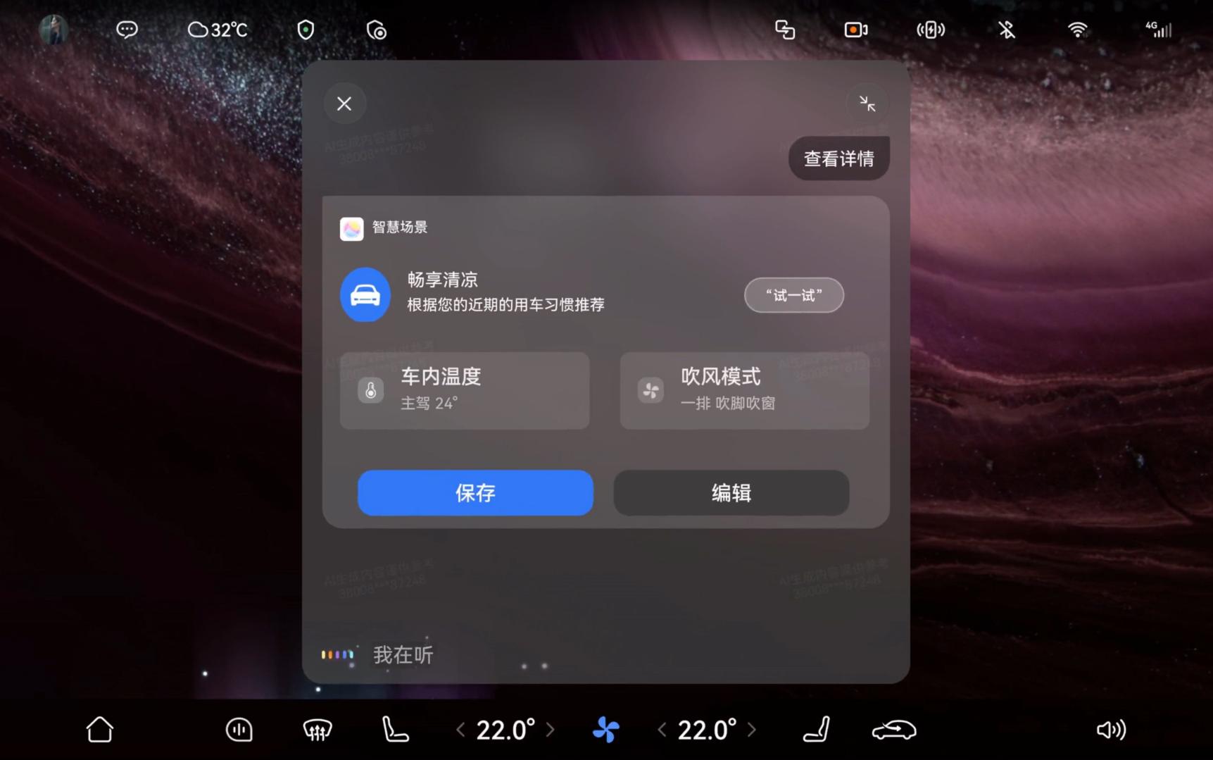 "小艺习惯推荐" 的出现让这些烦恼成为过去。当小艺通过15个行车周期的观察,发现你每天上车后都会将座椅调至最低位置、空调设为23度自动模式,便可以自定义生成习惯,习惯生成后首次上车会主动语音播报提示,一旦保存习惯,后续上车无需对话即可自动执行。无论是座椅角度、后视镜位置还是空调偏好,都能实现 "上车即舒适" 的无感体验,让每一次出行都恰到好处。