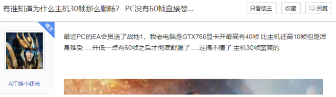 30帧在PC玩家看来卡到不行,而同样30帧的主机游戏却很少有人抱怨画面太卡,难道PC玩家已经进化出了比主机玩家更高帧的眼睛?也有不少既有主机又有PC的跨平台玩家会发现这样的问题,那就是主机上的30帧游戏要明显比PC上的30帧游戏要流畅。