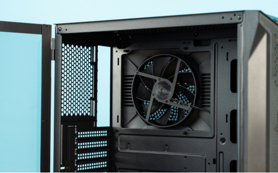 当然,就算抛开COC架构这个独居特色的技术,游戏帝国这款布洛芬C1也是一款可圈可点的甜品级中塔机箱。布洛芬C1采用标准7槽中塔设计,可以支持从mini-ITX到EATX尺寸的主板,同时也预装了定位铜柱,在硬件兼容性方面完全可以满足主流玩家的需求。除了COC架构标配的14cm风扇,布洛芬C1还可以额外安装8个机箱风扇,组建极为强大的散热系统,前脸铁网后可以安装3个12cm风扇(或360冷排)、顶部支持安装两个12cm风扇、底部也可安装两个12cm风扇(需要使用长杆螺丝固定),机箱还可选配控制器,支持对整机灯效进行同步快速切换。硬盘位方面,布洛芬C1提供了两个3.5英寸机械硬盘位和两个2.5英寸SSD硬盘位,分别位于电源仓和COC风扇下方,加上主板自带的M.2硬盘位,应该可以满足主流玩家的存储扩展需求了。机箱顶部和底部都提供了PVC防尘网,即便是配满风扇长时间使用,也不用担心机箱内积灰太快——这一点对于散热出色的机箱来说尤其重要。布洛芬C1配备了铰链式侧开全透钢化玻璃面板,仅需拉动拉环即可方便地打开侧面板,侧面板的铰链也可通过向上提拉侧面板而分离,装机非常方便。